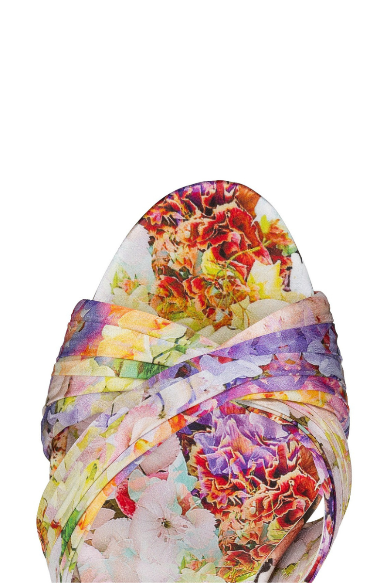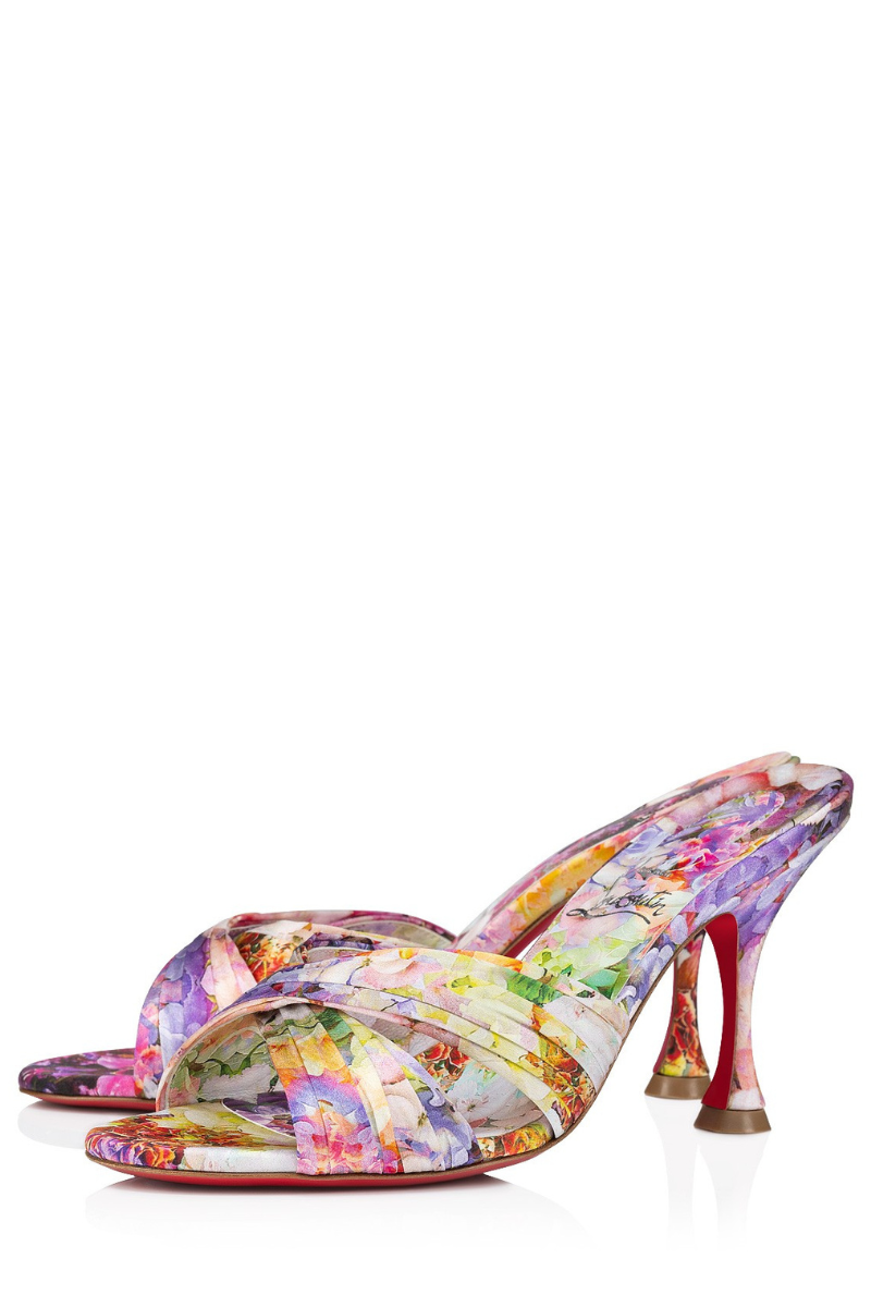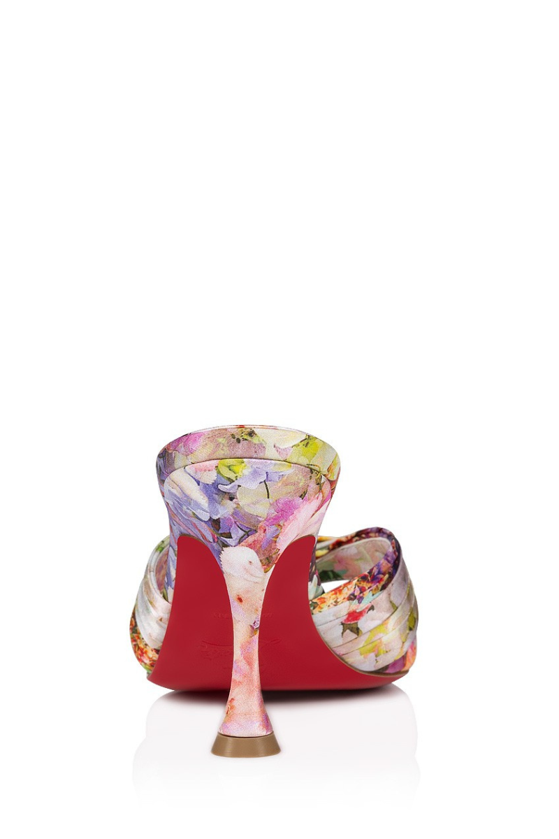 The Nicol Is Back mule features many sophisticated, elegant details. It is set on an original 85 mm Louis XV heel, and features two wide crisscrossing bands in crêpe satin, creating a draped effect. This Maison Christian Louboutin delicate model showcases a multicolored floral Blooming print. It is part of a special Valentine's Day collection.