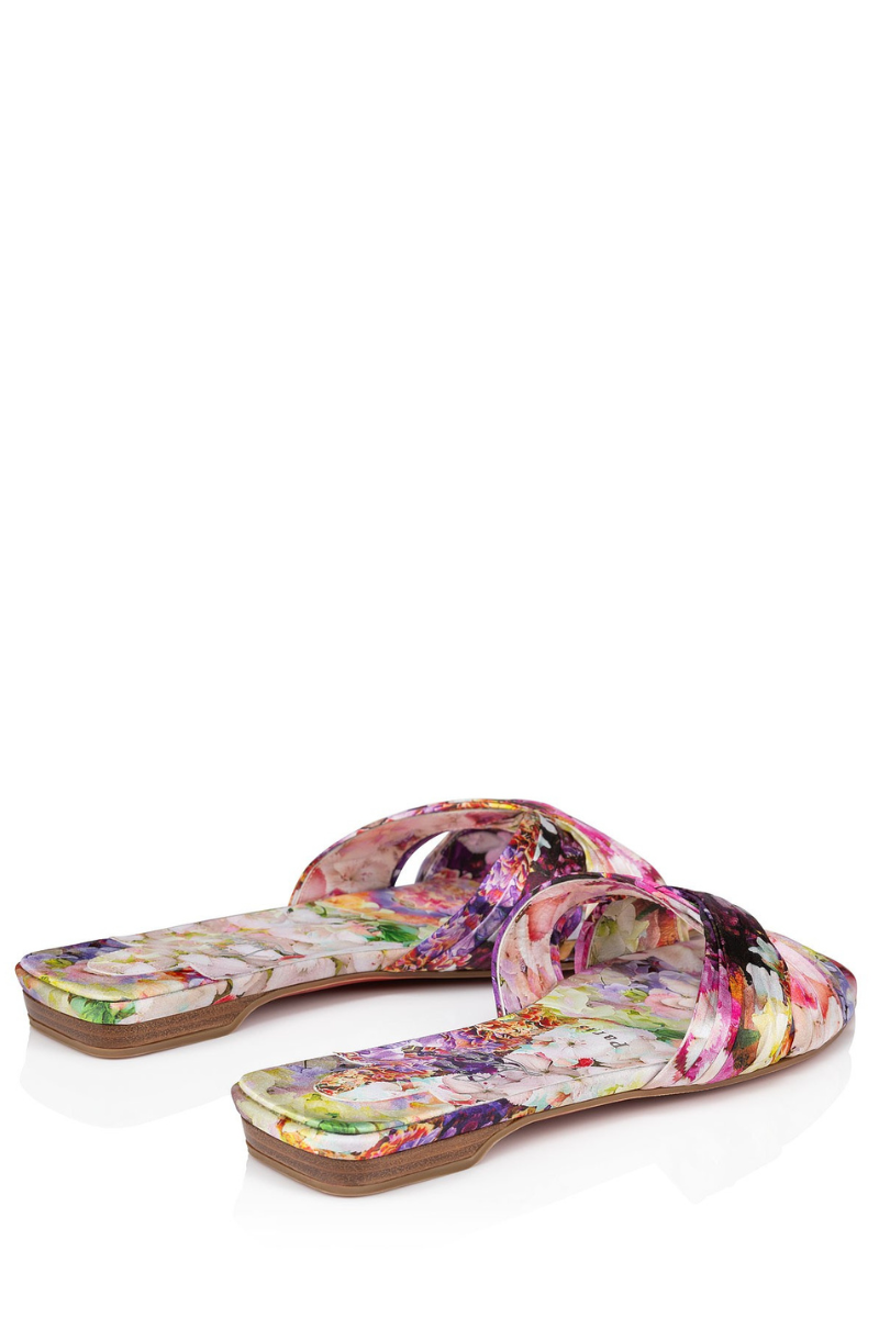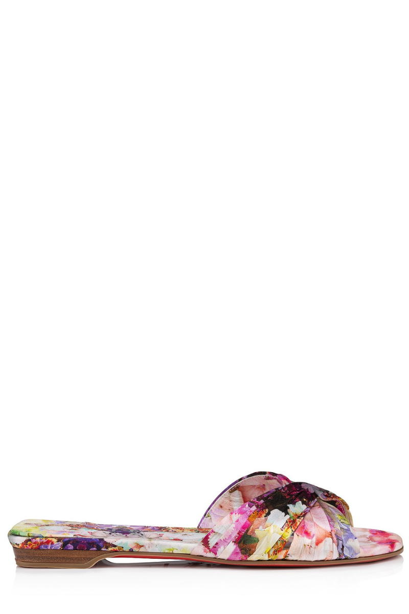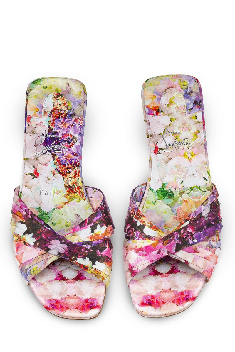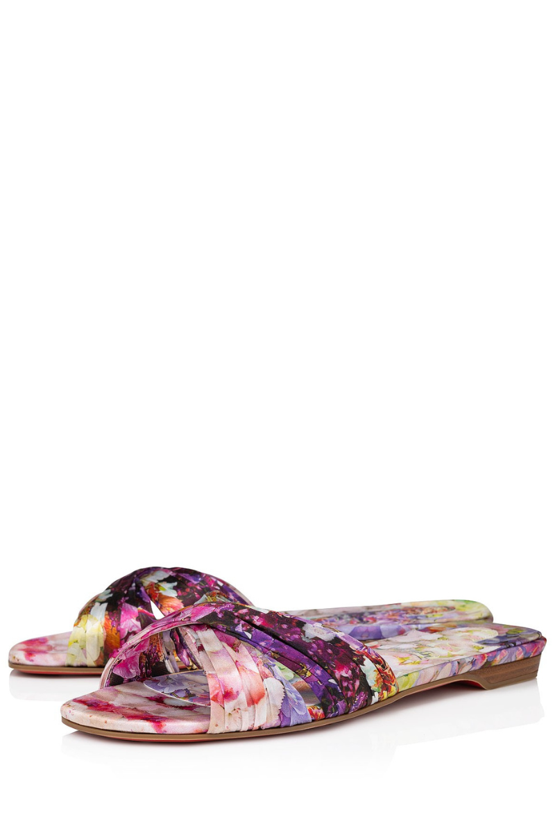 The elegant Nicol Is Back slip-on mule is dressed to impress for Maison Christian Louboutin’s Valentine’s capsule. The model features straps that are sewn, gathered, and ruffled by hand to create a detailed effect. The upper, the insole, and the heel are all adorned with floral-printed crepe satin.